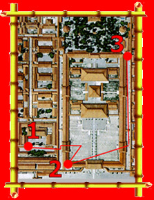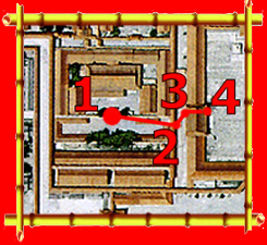 Leave the building and talk to the guards at the gate (see map to the right, number 1). They've seen ma leave the palace. Go to the red door on the right and go through it. Turn around and talk to the guards (number 2). They've seen Ma enter the nearby gate (number 3). Ask those guards again. Through the gate, turn around and ask those guards (number 4) if they know where Ma went. They don't but they've seen him go into the Tiger Cave.