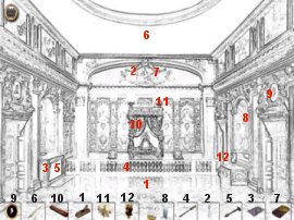 After placing the different items on the horse, click on the hitching ring or bridle bit to exit the frame. If done correctly, a cut scene will come up. If not done right, the game ends. The game ends when the wrong horse is chosen or when the sealed order is not taken from Boisseuilh before caparisoning the horse. (In my game, it took a while and several clicks on the hitching ring before the cut scene or game end message comes up - so just keep on clicking. Clicking on the bridle, stirrup or saddle also can get an end to the scene). You inform Minister Torcy that the sealed order was delivered. The King comes out and with an entourage of pages, courtiers and guards. You are introduced to the King by Minister Torcy. The King gives you the instance of Our satisfaction. Life in the Inner Court From then on, you are now of the court not just at the court as part of the King's group. The King keeps you in His presence in all functions of the court and gives you tasks concerning Spain. The German Emperor could not bring himself to sign the treaty, thinking that his son will be named heir. You are now a Gentleman of Chamber. The King now confides in you and gives you missions directly. Your life revolves around the King. Spanish line of Succession: You find yourself at a table at the Dining Room used for the Grand Couvert that was off limits before. A man of the Court talks about a rumor that the King laughed at the idea that Duc d'Anjou is in line for the Spanish succession. You tried to correct him but was derided by being a young upstart who knows more than those that have been serving the court for more than 20 years. He will not let you go until you prove what you said.