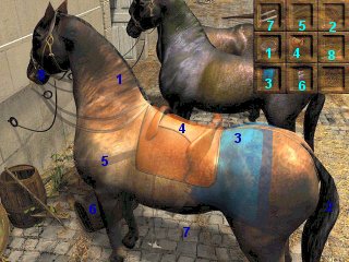 Minister Torcy is impressed but he does not know who P is. You state that it might be Comtesse de Perlitz and asks to be the one to intercept the Lady at Bondy. You are to go to the Grandes Ecurie, ask Boisseuilh for the best horse and directions to the stage posts. Torcy will send the imprisonment order to the Ecurie as soon as it is drawn up. Arrangements to be done at Grandes Ecuries to Stop Countess Perlitz: Go to Grandes Ecuries. Boisseuilh states that all the men in Ecurie are in the King's service and thus in yours. Turn around and talk to Golipeau, the groom combing the horse. He said that the best horse is next to the wagon. Turn to the right, forward and talk to a short ?man in blue. He says that the best horse is the racer with the white muzzle. Go towards the 3 horses by the door and turn right to the man reading a parchment. Talk to the man. He said the English racers with the short hair is the best horse and that he will also prepare your stages (directions to the stage posts). Go back to talk to Boisseuilh and he will give you the sealed order. Turn to the 3 horses. Now which horse? The horse closest to the door is also closest to the cart as well as having the shortest tail (cannot see the muzzle). Caparison the horse closest to the door.