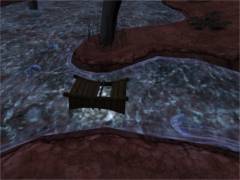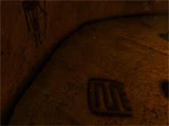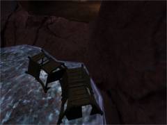 Now find the room with the blue data notebook on the table. Read this notebook also to learn more about the KI-device. Walk around the room and find another Journey stone on one of the chairs. Activate it and you'll end up on some balcony in D'ni city. Link back to Relto. I bet you think we are going straight back to Gahreesen. Well no... first we go on a small side trip to Teledahn. So take the orange book and click on the Journey sign. This will link you to the room you entered via the ladder. Turn around and exit via the door. Climb down the stairs and enter the next room. Turn to the left and walk towards the metal passage at your left. Stand between the wooden crates and the little mushrooms.