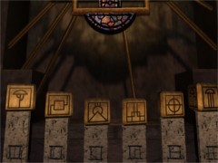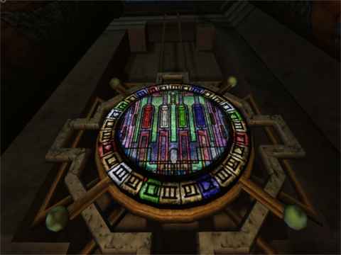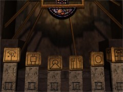 Examine this room. There is some kind of huge wheel laying on the floor. Notice that there are two pedals next to the wheel, one at the left and one at the right. At the wall at the back of the room you'll see four signs and four buttons. At the left side from these controls you'll see a Journey attached to the wall. Passed this wall you'll see a grate on the floor. When you step on this grate a huge column will start rising. Your goal is to power up this Age with this grate, the controls at the wall and the pedals next to the wheel. It's just a matter of being quick enough. Let's get started!