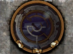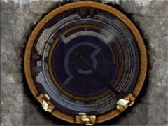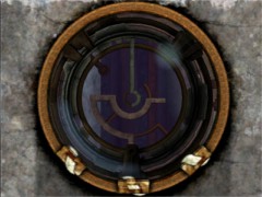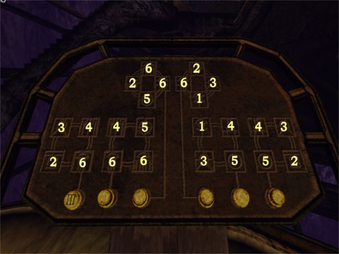 When you examined this room walk to the linking book on the pedestal and link back to the platform. Now look through the device. Look at the intern pattern. Now look at painting 1 in the room you where just a few moments ago. You should set the inner pattern corresponding to the top image. You can change the intern pattern by pressing the buttons in the correct order. For this first device the correct order of pressing the buttons is: the left button 4 times, the center button 1 time and the right button 5 times. Now the intern pattern must look exactly like this: