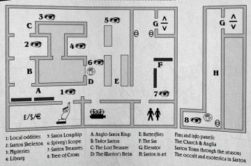 Read the newspaper seen on the sand floor. Learn about the treasure hunters that would be in Saxton. Professor Hardacre is Saxton's expert. Look close at the monster depicted on the wall.