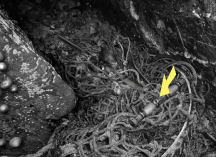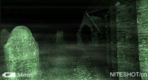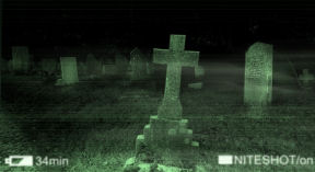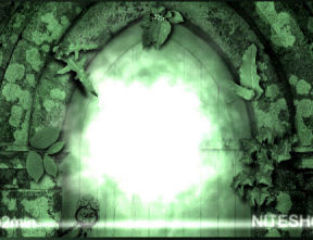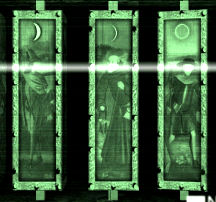 Gate: Go left of the sea monster on the wall and read the newspaper about the Spring tide's effect on the cemetery and the corpses. They are floating into the sea. Look through the gate by clicking on the top of the bars to get a close up. Hear sounds and shadows walking inside. Exit the cave.