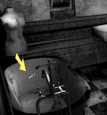 Bathroom: Enter next door and check the tub. Check the things on the cabinet and the mirror. Exit the bathroom.