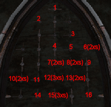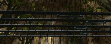 Go back to the other side and go down to the floor using the worn path before the console. See 4 horizontal bars that connect some cables. The top bar connects 5 cables, second - 4 cables, third - 3 cables and the bottom bar connects 2 cables. Each bar can lower only 2 cables as seen on the end knobs.