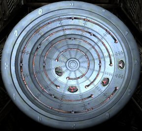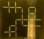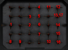 Rotating Corridor puzzle - Ahead are eight tumbler ramps that should be reset to form a corridor. In front is a stand that has 5 buttons. Each button rotates one to three tumbler ramps. Study which button rotates what ramp. Then press the buttons to get all the gold knobs on top and make a corridor at the base.