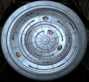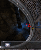 To find out what happens when you change any arrow position, go to the mesh bridge, forward and now that the beam is off, turn right to a ramp that goes up. Go forward and up the ramp. Look through the window and note of the position of the bars above the shuttle door on the right.