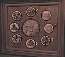 Turn around, move forward, turn right and look close at the engraved panel between the bookcases. Click on it and a wooden frame is revealed showing the geometric shapes shown on the desk parchment. Click on the geometric shapes in consecutive order shown by the roman numeral number associated with the shapes. The frame turns around and reveals the gold cross of the Grand Knight of the order of St. George. Pick it up. Go outside to the balcony.
