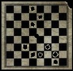 Look close on the chessboard and insert the chessboard paper found in the roll top desk underneath the chessboard. Open the red book and using Hopkins' eyeglasses, read the chessboard page. You will see the placements of the chess pieces. Move the real chess pieces by clicking on the letters at the bottom. Move the bottom black pieces first and the white piece on top last. Click on F, B, H, E, A, C, G, D. Pull out the chessboard paper. The paper has holes punched on the black and white squares tracing a path from the bottom to the top.