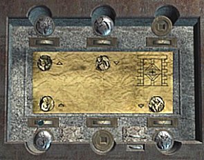 Turn left and pull chain. A drawbridge to the center appears. Move forward. The drawbridge is pulled in and you get trapped at the center. Surrounding the center are 6 outlets on dragon heads on the wall spewing fire and 6 hanging chains that close the fire outlets. The open doorway is on your back, the column with a carved stone is in front of you, numbering the hanging chains clockwise 1, 2, 3 on your right and 6, 5, 4 on your left, pull chains 3, 5, 2, 6, 4, 1. The outlets are closed and the drawbridge appears. Move forward to the column with a carving and pick up a handle that looks like 2 dragons. The column turns and a door appears. Go through door and find yourself on the stand level of the gazebo. You have gone through the 2 stairs, now move forward to the opposite stairs going down. Enter.