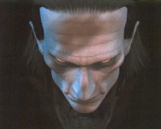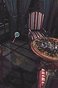 Now it is time to enter the house. Use the key on the door knob and go inside. Go up the stairs and enter the room at the top. Go forward toward the dresser. Open the film cans labeled Styx and pick up a token, notched paper, and box of matches. Look up at the picture on the wall. Click on it and then after you hear about Carfax, turn the picture over and pick up the note attached to the back. Turn to your right and open the chest. Pick up the telescope and candleholder. Turn to your right again and go over to the desk. Open the drawer on the right side and pick up the compass, key/cylinder mechanism, the book and the candle. Read the book from your inventory. Turn right and go in back of the screen. It is dark back there! Place the candle holder on the table and then use your matches on the candle. Place the lighted candle on the holder. Ah! Now we can see there is a key hanging on the wall. In your inventory use the bullets on the gun to load it. Good idea to get it ready! Turn toward the door next to the screen and use the key on the door knob. Enter that room and look at Pibody. Before taking the key from his jacket SAVE YOUR GAME! As soon as you pick up the key a large vampire bat will breakdown the door. Turn around and shoot the door lock. Open the door and go forward once into the room, turn around and move the dresser that is on the left side of the door to block it off from the vampire bat. Now you can take your time to explore the room safely. Pick up the chair in front of the fireplace and put it below the round boarded up window. Look in the fireplace and get the other knob and the poker. Use the poker to remove the boards from the window. Go to the other side of the room and pick up the large mirror. Place it in the middle of the room, then slide the dresser back away from the door allowing the werewolf to enter. Protected by the sun! Pick up the other mirror and leave the room. As you are leaving the room you originally started in you will see a vampire bat standing by the doorway. SAVE YOUR GAME! Go forward once into that room, look down and place the mirror there. Another bat will disintegrate! There are more vampire bats outside on the balcony and down stairs. Since you can't go right, turn left and quickly go to the end of the balcony and click on the chandelier! Watch the video scene.
