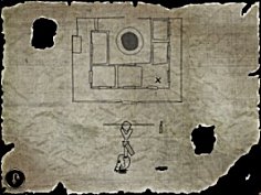 Go to the chessboard on the wall. Turn right, look close on another carved head missing an eye. Place pink jewel on the right eye slot. The chessboard wall rotate, enter, go to the very end of the passage. The second from the end prison bars has an opening. Enter. Turn left, move forward, turn right and look down at a skeleton. Move his rib cage and dig using the spade. Pick up the bone. Move forward, look down at another skeleton. Move him and dig again. Pick up parchment and skull. Kazan, the writer of the parchment asks that you find and free his Lord Radu and states that they made a way to get to him. Look close on the parchment and it shows the layout of the prison and an arrangement of skull, bone, stone and candle.