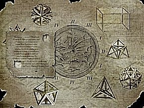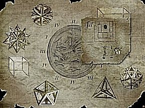 Go forward to the end of the room. Open the roll top desk. Pick up the chessboard paper. Use crowbar of the inside panel on the left side of the desk. A parchment rolls out. Look close on the parchment. Get the translated parchment with 2 square-shaped holes. Click it over the desk parchment. Then click on different shapes to move the translated parchment. Note the geometric shapes that when selected/clicked on shows a roman numeral number on the other squared-shaped hole. The opposite square-shaped hole will show only a part of the selected shape. There will be 2 shapes with corresponding numbers on the desk parchment seen. Turn the translated parchment over and do it again. There will be 2 more shapes with corresponding numbers seen. They are I - 3 dimensional cube, II - Sphere made up of triangles, III - Pyramidoid with 4 sided base made up of triangles and IV - starburst made up of triangles.
