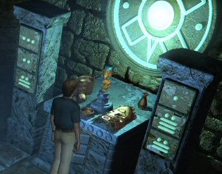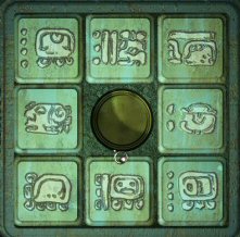 Open the entrance to inner part of temple - Take stone on floor by middle column. Place the pyramid on the stone pedestal. Click on the opening in the middle of the Sun held by the Mayan Sun God. Martin opens the cover and rays pass through the prism to shoot out 3 rays on the squares on the floor. Pedro stands on one square. Place the stone on one of the 2 squares. Now, step on the last square.