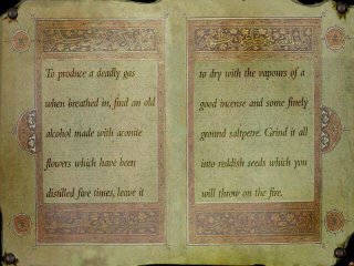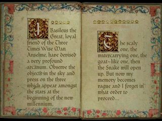 Back to the grate in the fireplace. Use rope on the left of the open grate. King's Bedroom: Inventory needed - saltpeter, aconite, torch, small key for manuscript clasp. Luckily, the fire is out on this fireplace. Pick up the stool on the left side of the bed. The inventory chest is at the foot of the bed. Open the armoire and get the incense. We now have all the ingredients for the deadly gas. Combine incense and aconite producing yellow seeds, add saltpeter and produce red seeds. Still facing the armoire, look on the floor and use stool on the hotspot. Climb on it and see the dark top of the armoire. Use torch/flashlight and pick up silver key. Enter the curtain on the corner of the room to go to the library. Library: The library is full of open books and surrounded by paneling with astrological signs decorating the top. King Charles V mistakes you for the help of the Papal Legate and points to the encoded manuscript to be given to the Holy Father. Pick up the encoded royal manuscript revealing the access to Pazuzu's hiding place. We have to decode this. We cannot look for the Basileus manuscript until the king leaves. Exit the library, hear footsteps and come back in. Look close on the book on right of the bookstand in front of the King's bench. Use the red small key for manuscript clasp. It talks about pressing the 3 objects in the sky at the beginning of the new millennium - the scaly one, the water carrying one, the goat like one, then the snake will open up.