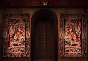 We need the year for the birthday and based on the clues on the back of the King's throne in the Kings portraits gallery, we need to look for huntsmen. Go to the other end of the hall. There were tapestries about hunting. By flipping through the pictures, produce a mirror image of a huntsman carrying dead birds. The top of the arch shows 1553. Let us now look for the scepter and the bull shaped pendular key. Go to the Ambassador's room.
