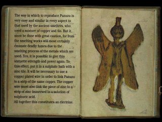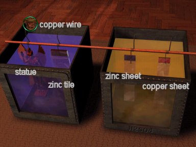 Look close on left bookcase. Pick up memorandum on electricity. Read the book. There is instruction on how to make a Leyden jar. Look on the table closest to the bookcases, there is already a set up for making Leyden jar. Use generator crank handle on the cylinder. Pick up Leyden jar. Let us now see to getting to that sculptor. Go to Diane's room. Diane's Room: Short-circuit the lock on the double door with the fancy copper knobs. Use Leyden jar on knobs. Wow! It worked. Enter. Apollo's Gallery: Inventory needed: notes from a scientific expedition in Persia, copper ridgepole, gas mask. Talk to the painter on the right. His name is Joseph Duplessis. Turn left and go down the hall, pick up the stepladder on the way. The inventory chest is at the end of the hallway. Enter door on the right. Square Room: We're getting closer to finding the sculptor's gallery. This is a room full of paintings. Look but don't touch!! (If you want to touch a painting, go right ahead. Don't say I didn't warn you!) Go to the other end of the room and pick up exhibition catalogue from the Square Salon sitting on a desk. Read it. Look at that! #18 is our friend Mr. Duplessis' painting of Christophe Gabriel Allegrain, Sculptor. Go down the stairs. Sculptor's Workshop: We are here. The inventory chest is just in front of the open door. Pick up the bag of coal from down the hall. That was heavy! Enter through the open door. Talk to the sculptor. Morgan asks that the sculptor make a mold of a statuette for her. The sculptor will do it immediately if Morgan can get the picture of Christophe Allegrain for him since he cannot afford it. It would be better if there were a picture of a chisel and mallet on it. That is the picture done by Joseph Duplessis. Give the notes from a scientific expedition in Persia with the picture of Pazuzu to the sculptor. Go to square room. Square Room: The picture is on top of the second panel of paintings to the right of the stairs. Use stepladder on the floor in front of the panel of paintings. Pick up the portrait of Christophe Gabriel Allegrain. It does not have a chisel and mallet on it. Let us go talk to Mr. Duplessis at the Apollo room. Apollo Room: Talk to Mr. Duplessis. Use portrait on canvas. Pick up the portrait. Go back to the sculptor. Sculptor's Workshop: Use the portrait to the sculptor. The sculptor shows Morgan how he made the mold. Use bag of coal on oven. From the secret writings on notes from a scientific expedition in Persia, we need copper and tin. Use copper ridgepole on melting tank on top of the stove. Open cabinet by the door and pick up the pewter crockery. Marquis de Nemours arrives and has a gun pointed at Morgan. He has been observing her and suspected her from the beginning because of her interest on Pazuzu. He tells her to finish her researches and they will talk later. Place pewter crockery on the melting tank on top of the stove. Remember what the instruction said - that the smelting process would release deadly fumes. The tin and copper melted and poured into the mold. The fume starts to thicken. Use the gas mask. Why do we end up killing these men!! Above the door, pick up the sculpting mallet. Use it on the mold. Pick up the reconstruction of the Assyrian demon Pazuzu statuette. Let us now energize the statue. Go back to the science academy. Science Academy: Inventory needed - sulphate flask, Pazuzu statuette, zinc tile, zinc sheet, copper sheet, copper wire, general purpose formula. Look close on the table at the center of the room. Following the instructions from the secret writings on notes from a scientific expedition in Persia, we need a sulphate bath. Use the sulphate flask on the empty tank on the left. Use Pazuzu statuette on the left side of the left blue tank and the zinc tile on the right side of the blue tank. Then use sheet of zinc on the left side of the right yellow tank and the sheet of copper on the right side of the yellow tank. Use copper wire on the top left of the left blue bath. Pazuzu's statue is now energized.