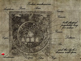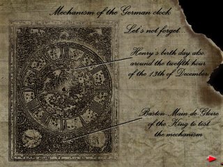 Great! That might be what we need to get to the Ambassador's room. Pick up the Holy Water from the second drawer. Look close and open the window shutter on the left of the cabinet. Lets take in the view. Pan to the right and click. There are the windows of the Kings portraits gallery that is above the room adjacent to our destination - Ambassador room. Use the hook-launching crossbow on the windows across the way. Kings Portrait Gallery: Inventory needed - signet ring, general purpose formula, knife, crossbow with bolt, gas mask. Turn around and see a throne in front, fireplace on right and the portrait gallery on the left. The inventory chest is at the far end of the room on the left. Might need to empty the inventory of non-essentials. Go to the fireplace and turn around and look at back of throne. There is writing on it but too dark to read. Turn to the left of the fireplace and look close at chest, get log, use log on fireplace. Now there's light. Let us read the writing on the back of the throne. "Follow the path shown by the huntsmen and you will find the birth year of the greatest among them". What is that for? Pick up the fire tong from the right side of the fireplace. Now let us look for that secret passage based on the royal note revealing the entrance to a secret passage. Starting from the window we came in (L-R), use signet ring on the H at the bottom of the pictures of Louis XI (third), Francois I (fifth), Charles VIII (fourth), Francois II (seventh). A sound is heard every time we use the ring. Go down the hall and look under Marie de Medicis, the last portrait on the right. Enter the opened secret passage. Use the general purpose formula on sealed brick door. Enter. Ambassador's Room: Do not move! (There is a guard on the left side hidden by the candle stand). Standing by the secret passage, we look around. Wait, it is a room full of eagle vase in different colors. The column closest to us has a plaque in Latin. "Ex animis daimon rubram aquilam prospecter: tune potentior resurget". Walking close to the right side wall, go forward. Turn left. Go underneath the scaffolding. Turn left, look close and use knife on scaffolding drapes. There is the guard! We have to do something. Use crossbow with bolt on guard. The Jesuit priest comes and talks to Morgan. If he calls the guard, she would not be of any use to him because the guards have been torturing suspicious people. He wants to make a deal. Morgan would give him what he wants in exchange for the translation of the Latin inscription. Morgan agrees. The translation of the Latin inscription is "When the dead demon looks at the red and powerful eagle, he will come back to life". Look close on the purple eagle vase in front of the priest under the scaffolding. Use the daemon on the opening on the pedestal. He will then be facing the red eagle across the room. Remember the warning of the alchemist, use gas mask. The priest suffocates and the daemon statue is gone. The young Prince comes and says based on the mask, he thinks Morgan is involved on sorcery and wants her to help him shed light on the death of his father. He does not trust anyone and will be grateful. Morgan agrees and asks him for information concerning the bull shaped foundation. He asks that Morgan meet him at the King's bedroom. Pick up the vase with a Roman eagle on top. Lose one, get one. Go to the small ground floor gallery. Small Ground Floor Gallery: Way down the other end of the hall is a snoring guard. Look close and pick up the lead gun bullets and the powder flask. The inventory chest is opposite the snoring guard. Now let us see what we can do to help the young Prince. Go see Jacquelyn again at the Cup-bearer's room. Cup Bearer's Room: Inventory needed: Holy water, magic formula for revelation. Since she just fainted we can try to revive her and ask questions especially about the letter the Queen wants us to find. Use Holy water on Jacquelyn. Jacquelyn wakes up and say that she is in the service of Marquess de Verneuil and saw her and M. le duc d'Epernon plot the murder of the King and that she was carrying a letter from her to him. She hid the letter in this room. Then she fainted again. Turn right and look in window. Pick up royal books. Go to inventory chest and then turn right to the floor under the fountain. Place books on the floor. Climb on books. Pick up missive written with invisible ink and combine it with magic formula for revelation producing very incriminating missive. Written by Mde. de Verneuil to M. le duc d'Epernon, she says that the Ravaillac has not failed in his promise. Oh My! Let us find the Prince. Go to King's bedroom. King's Bedroom: Give very incriminating missive to the young Prince. The future King is most grateful. The Prince states that the bull shaped foundation can be found in a clock made by M. Gauthier. His father placed great importance to it and a cow is part of the family's coat of arms. M. Gauthier also devised a secret mechanism to open a secret drawer. As they speak, Mr. de la Force's men in the garden are questioning M. Gauthier. Garden, where is the garden? Let us try the small ground floor gallery. Small Ground Floor Gallery: Inventory needed - hammer and chisel, fire tongs. Listen, somebody is being tortured. Maybe we can find them by following the sound. Here at the fifth window from the end with the snoring guard, the sound is the loudest and by the bench beside it are the sketches of the German clock drawn by Mr. Gauthier. Use eye icon to look closer on the sketch. We need Henry's Birthday (around the 12th hour of the 13th of December), the King's scepter to test the mechanism and Bull shaped pendular key for Zodiac.