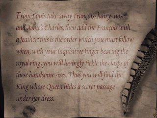 A door opens. Combine crossbow, rope and hook. Turn around and look up on the balcony. Use combined crossbow, rope and hook. Pick up hammer and chisel. Turn around and enter the secret passage. Library: The descendant of Anselme tells Morgan about the suspicions abounding due to the recent murder of King Henri by Ravaillac. M. de la Force and his men tortures anybody connected with the crime. The Queen herself is under suspicion that she had a hand in it. Morgan looks a lot like Jacqueline that helped the killer. He gives Morgan a spell invented by Anselme himself that can let her pass through walls like a spirit and he is preparing a potion to put to sleep the footmen that might get in her way but needs 2 ingredients, a metal and a plant. Pick up the general purpose formula found on stand, to the right of the alchemist. Use hemlock and antimony tablet on the brew that the alchemist is preparing producing a green bottle. Pick up flask of neutralizing solution. The alchemist tells Morgan that potion will slow people down and to beware of the demon Pazuzu because he is the god of the evil wind that can rock the air causing deadly infections. Someone is listening. Now to see how we can get to the Ambassador's room starting at the King's bedroom. Go to the tribunal. Tribunal: Use sideboard key on door by inventory chest. Climb the stairs. First Floor Service Area: Look close on panel on the right of stairs. Use key for service lift on panel lock. Click on lever. Pick up basket. Enter the King's bedroom. King's Bedroom: The inventory chest is on the wall across the bed. We can't do anything in this room unless we get the footman out of the way. Approach the footman by the door, and use the green bottle on him. Look close at the footman under the bed and pick up the royal signet ring. Examine the interesting clock (remember Dictaphone narration). Look close at the cabinet at the far corner. Open it, then the 2 right drawers. Pick up the royal note revealing the entrance to a secret passage from the top drawer.