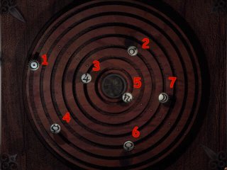 The 3 constellations seen at the start of every year are Capricorn (goat like one, December 22 - January 20), Aquarius (water carrying one, January 21 - February 19) and Pisces (scaly one, February 20 -March 20). Look close on the panel on the left of the doorway and click on the goat, then the water carrier (2 panels to the left) and then the fish at the center between the goat and water carrier. The cabinet below the ourobourus/snake opens found at the center of the wall of panels and pick up the ivory plate used for secret royal missives. Now we can decode the manuscript. Combine encoded royal manuscript revealing the access to Pazuzu's hiding place and ivory plate used for secret royal missives. Look close at the decoded royal manuscript using the eye icon in inventory. With planetary signs interspersed, the decoded message reads - Pasusu in treasure room is hidden. Note the placement of the astrological signs. The treasure room is where the eagle and the lion are also. Guess where we're going! But the only way we found is the ramp and it is guarded. Go to the King's large bedroom. Large King's Bedroom: Inventory needed - crossbow loaded with bolt, knife. Use knife on window (guess someone fixed it) and see the guard again. There is no way we can get to the treasury room without his catching us. Use loaded crossbow on guard. Let us check what happened to him in the moat. Moat: Go around the moat and find the dead soldier. Pick up the gold key. Courtyard: Inventory needed - combined crossbow with rope and hook, gas mask, silver key, gold key, red seeds. Go in front of the door to the cup-bearer's room. Turn right and up. You will see a lighted torch on the walkway from the castle to the dungeon and Royal Treasury. Use the combined crossbow/rope/hook on the walkway by the torch. Look close on the puzzle on the door to the Royal Treasury. Study the decoded message and note the planetary signs from top to bottom, then click on the door puzzle's planetary signs in the same order. Sun, Mars, Jupiter, Mercury, Saturn, Venus, Moon.