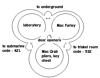 There are 3 exits: 1. Stairs going down to raven underground where we came from. 2. The stairs going up to the Triskel room, access code 532. 3. Hatch cover/stairs down to submarine, access code 421. The inner area has 3 rooms: where Mac Farley is, Mac Grab's office and the chemical laboratory. At the very center is a column that has buttons to access the 3 rooms. Stop Mac Grab Mac Grab's office - When they leave, you have the freedom to roam the place. Enter the inner chambers and go in Mac Grab's room - the only door open. Look close at the apparatus on the wall. Click on it to switch the power on, this allows the door openers to be used. Turn around and pick up the Triskel chest from the desk. Open the drawer and get the platinum key and the metallic pliers. Exit the room. Go to the center pillar and click on the 2 upper buttons to open the other rooms. Go to the left open door of the laboratory. Laboratory - Turn right and look close at the book on the bookshelf. There are 2 formulas.