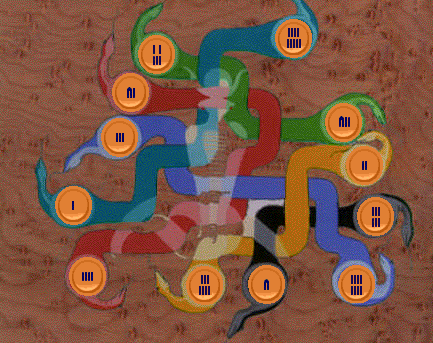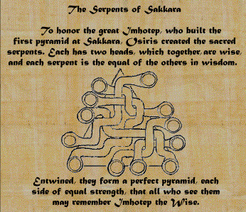 Note that the Snake Puzzle abstractly looks like a pyramid with four number disks on each of the three sides (4 on left, 4 on right, 4 on bottom). Note that there are six snakes, each with two heads, a number disk in each head. Disks numbered 10, 11, and 12 are fixed. To solve this puzzle, the sums of the 4 disks on each side of the pyramid must total 26, and at the same time, the sum of the two heads of each snake must total 13. Once you have done this correctly, the drawer will open and you can pick up the Eye of Horus.