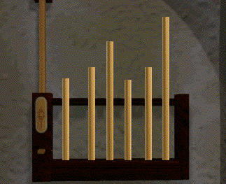 Go back to the Orb Room and push the Element Key for Air. Go to the end of the tunnel into the organ room. The door shuts behind you. The only way to open the door to get out is to solve the organ puzzle. Listen to the sounds being played. You must make the pipes in the puzzle sound the same tune. The solution looks as below. When the hand appears, click it to play the pipes in order from right to left as they appear in the rack. You have to move the pipes around in the rack until they look like this and play the same song. When successful, the door will open again. There is no Obelisk. here.