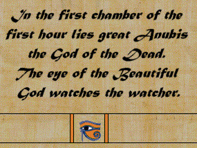 You are in Osiris Court. Go F,L Priestess appears with message to find Horus’ Amulet and restore it to him. Go F, F and you are standing in front of the door to the Great Court of Horus. Open it. Go F, F, F and you will be standing in front of the Statue of Horus. Go F, L, F, R, D and pick up Horus’ Amulet (to pick up, click the "hand" on it; automatically it will be transferred to your inventory). Note there is a video-tape machine next to the Amulet. You can’t do anything with this until you have put the Amulet in Horus’ chest. Go U, R, R, R, F, L, F, L, L to again stand in front of the statue of Horus. Click on the Amulet in your inventory and drag it to the light spot in Horus’ chest. The Priestess will appear and say you can now pass.