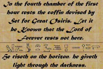 Go U, T, F, R, F and read ragged parchment paper on the desk. Next, click on the scroll on the desk and the scroll will open. If you move the cursor over the right side of the opened scroll, to the right-pointing finger, and click, you will read more of the scroll. Keep clicking on the side until the entire scroll is read. Note one scroll page with symbols of the four elements (air, fire, water and earth) and another page with symbols for the four directions (North, East, South and West) -- these eight symbols are needed to solve the Obelisk Puzzle. Note other pages talk about the offerings needed to take a boat ride across the river to the east bank (Anubis, Horus, and Urn of Wheat).