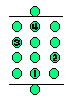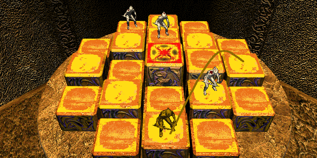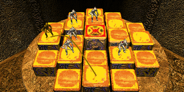 This is the warrior checkers puzzle. There are six warriors (one Bronze and five Silver). The object of the puzzle is to jump over another warrior like you would in checkers. Any warrior can jump over any other warrior, regardless of color. To win, the Bronze warrior must be standing alone on the center "X" square. Solution:
