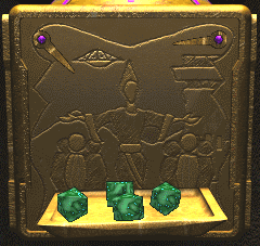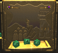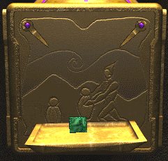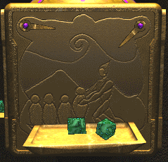 Merchant Crypt Puzzle The object of this puzzle is to pick up the ten green jewels from the two trays, and use the ten jewels in drawers that pop out of the box. The box spins around. There are two levers on each of the four sides of the box. Manipulate the levers (each lever has three possible positions) until you find the combination that will open a drawer. Open all four drawers (one on each of the four sides). Study the pictures on the sides of the box. You must place the ten jewels in the drawers: one drawer gets 1, another drawer gets 2, another drawer gets 3,and the other drawer gets 4. Solution: