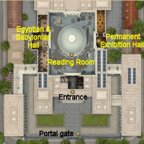 Entrance: Pan right and talk to Palinor, the apprentice-archivist about the Director and Ledger. Sir Poynter, the Director is talking to an insistent artist. Palinor lost the ledger.
