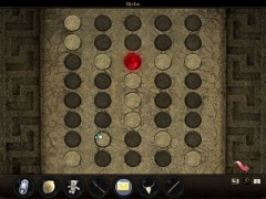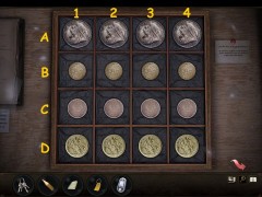 When you are back in his room, examine the relief disk. Take the coin from the disk. Zoom out. If you like you can examine the three vases, the shield and the mask in the room. Exit the room. Enter daddy's office. Walk to the left. Remember you have seen the coin show case at the left side of the office. Walk to the coin showcase. Examine it and put the coin in the empty compartment. Read the note at the right side. You have to re-order the coins so that there are no same coins in a row. I know that there are many ways to solve this puzzle. I give you one of the many solutions. Please don't email me to tell me that you found another solution!