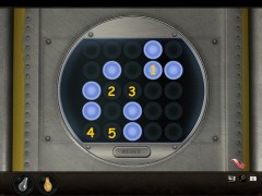 Notice that there are four of these little statues in the room. Turn them all so that they are all facing the same way good old Lenin is looking. Yep... to the left. This opens a secret compartment behind Lenin's portrait. Enter the secret compartment which turns out to be a torture room. Examine the painting. Examine the flap at the left wall. Examine the torture chair. Take the book from the chair. Exit the torture room. Place the book on the empty spot of the right book case. Re-enter the torture room. Notice that the flap in the wall is opened. Place the skull in the niche. Examine the safe. You have to click the lamps in a correct order to turn all the lamps off. Here is the correct order.