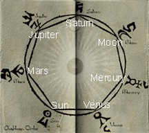 Chaldean Order Puzzle: Look close at the plate puzzle on the table. The object of the puzzle is to connect the planets using the colored lines at the bottom of the plate in the order of the days of the week. The puzzle is explained at the bottom of the weekday page of black book 1.