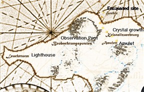 Lighthouse: Turn right and see a locked door. Click on door several times and hear something drop. Look down, take key and it will automatically open the door. Enter, turn right and look close at table. Look at the map and see that there are German notations. The Germans must have been here during wartime. Note the lighthouse, observation point, amulet, crystal growth area and the excavation or cave site. A path on the water to the amulet area is seen - submarine route? Exit the lighthouse.