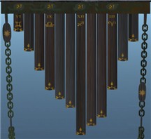 Wind chime puzzle: The object of the puzzle is to arrange the chimes in the order of dusk to the dawn. Click on a chime and then click on the place you want to move it to. When completed successfully, the wind chimes and a slot opens. Take Sacred Key and harp string #3. Now, 3 are lit at Ascension harp box. Go back to the ruined building before the second hanging bridge.