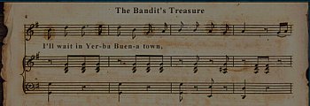 Circle the room, read the E.Valdez (Elizabeth Applegate's) diary. Pick up the tile, iron, and crowbar. Use the key you got from the bed post to open the small writing desk. Look at the music and lyrics for The Bandit's Treasure. There are 5 notes on the top row that are darkened. Might be important to remember.