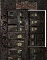 Return the boots to Professor Hotchkiss then take the elevator back down to talk with Dexter. [To return the boots, place them in the hall in front of her door. As you turn and walk away you will hear her open the door and take the boots.] You will get stuck in the elevator and the emergency button doesn't work! Turn around and look up for a way out. Jumping across to the metal ladder along the wall is a little risky, perhaps you can find another way. After you get back to the hall head down the stairs to talk with Dexter and let him know the elevator is broken also. He tells you that the lights in the upper spiral staircase are out and asks you to check the circuit breakers. Move the 3 sets as shown in the picture, then reset the elevator with the lever.