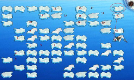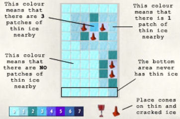 Skating Pond - Skating pond maintenance shows that the pond must be shoveled after every snowfall. Read the warning carefully. It mentions that there is some thin ice in the pond and only the safe parts are to be swept. The gauge below the page shows the ice thickness by the color. Place orange safety cone on the dangerously thin ice.