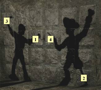 A cutscene follows. Try to talk to Long John, and the hero will note how Long John is wiggling his fingers. Combine the Slate and Crayons and the Damp Sponge, and place A Blank Slate and Crayon in Long John's hand. A cutscene follows. You can pick up the Slate with a Drawing in your inventory, and read the box at the bottom of the inventory screen to learn what Long John has drawn on the slate. Then, place the Mirror either on the snake's face or on the circular stone on the ground in front of you. And then,