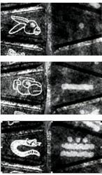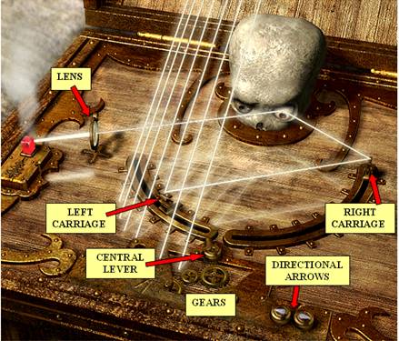 Close the Enigma box. [You can click on the glyph above the secret passage, or just press Enter, to open that box again.] Turn to the stone mechanism on your right. Bring out the large and small disks from your inventory and put them in their respective slots at the top of the mechanism. Pepita gives you some information. Turn back to the mechanism. Note the white button under the two disks, but don't press it yet. Click on the Eye icon on the black glyph under the white button, to hear Long John explain what it means.