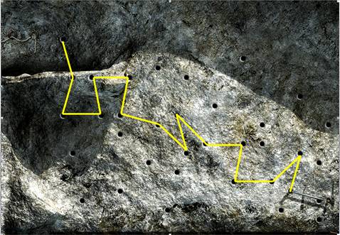 It is really easy to solve this puzzle but much harder to explain the solution. I hope that the following picture will help. Imagine that the tube between the two daggers left an imprint on the rocks. Thus, each one-inch segment of the yellow line shown below represents such an imaginary imprint; and together, they mark the route that you must take as you proceed from the lower-right to the upper-left portion of the screen.