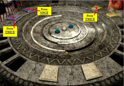 Close the Enigma box. Click on the Eye icon on the three blue circles on the wall, and Long John will tell you that it is the glyph representing the moon. In fact, this "Lunar Symbol" depicts the solution to this part of the Enigma: the three balls (in the center of the structure in front of us) must be all BLUE; and the three white lines around the balls must appear in the same position around those balls as they do in the glyph. Here is how to accomplish that.