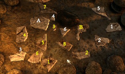 Click the stones to activate the puzzle. Hit the stones with the hammer. Hit the stones one after another (overlap the tones) with the 2 pauses in between.