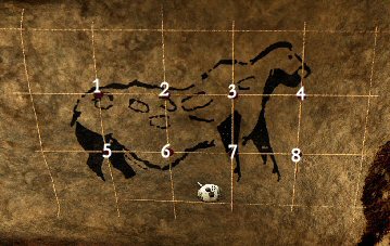 Finish the frescos - Get the gnarl tree cut and place it at the other side below the unfinished drawing. Climb up to look close at the outline of 3 stags. The necessary colors to use are shown by the lines and dots beside the stags.