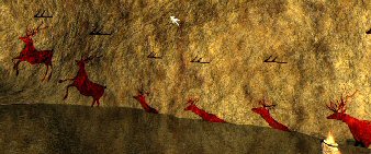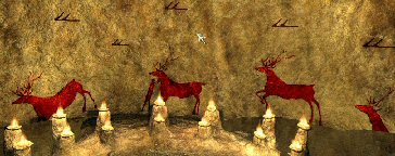Cross to the center isle, turn right and forward to the other end. Note a fire pit on the right. Take the long branch and the Auroch's horn from the ground. Go back to the other side and get embers from the lit fire pit by clicking the Auroch's horn on the fire. Go back to the center isle and oops! We're not going back there anytime soon. Click the embers on the unlit fire pit. WOW! look at those stags.