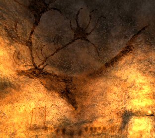Stag fresco - The object of the puzzle is to light the oil lamps and get the stag moving so that we can get to the other side. There are 14 oil lamps in front of the fresco. The fresco is made up stags of different colors going from right to left, in and out of the water. At the center is a man that is beside one of the stags.