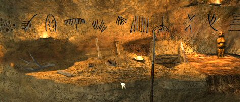Go forward once to the entrance of the White Grotto. Pick up the little stick on the ground and the piece of bark on the stone. Forward once into the cave and look down. Take the strap, black pigment and block of ochre pigment from the rock shelf.